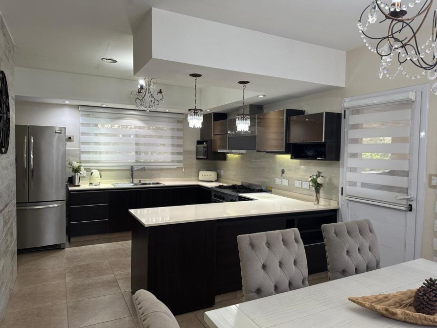 - Cocina con alacena y bajo mesada. Mesada y breakfast de Silestone blanco, Cocina tipo industrial.